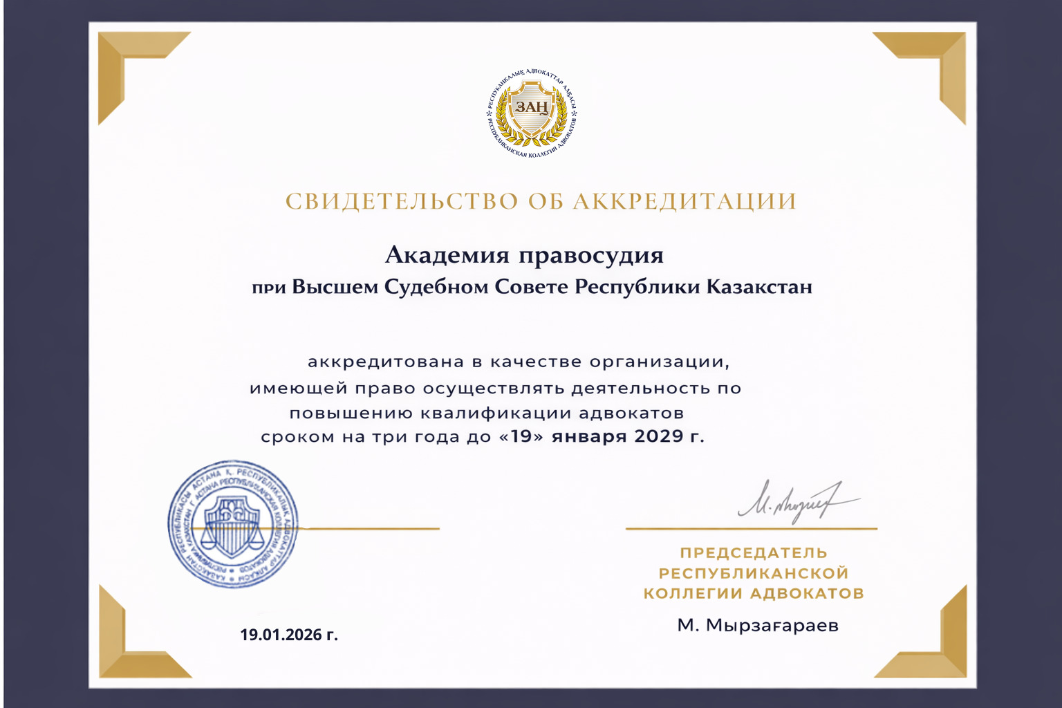 Жоғары Сот Кеңесінің жанындағы Сот төрелігі академиясы адвокаттардың біліктілігін арттыру бойынша қайта аккредиттеуден өтті 2026 жылғы 19 қаңтарда Қазақстан Республикасы Жоғары Сот …
